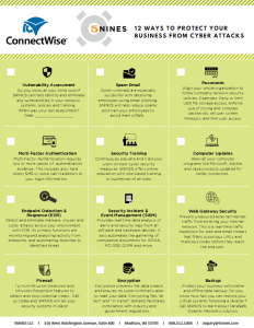 As working remotely becomes the norm for business owners and their employees, company cybersecurity becomes more important than ever. While some businesses have a good network security and policies in place, others have poor understanding of how to secure their employees and company data from cyber-attacks. This infographic includes 12 important elements of advanced security protection accessible to businesses of all sizes. If you don’t have a dedicated IT team or need help setting these security measures, please reach out to us at inquiry@5nines.com.