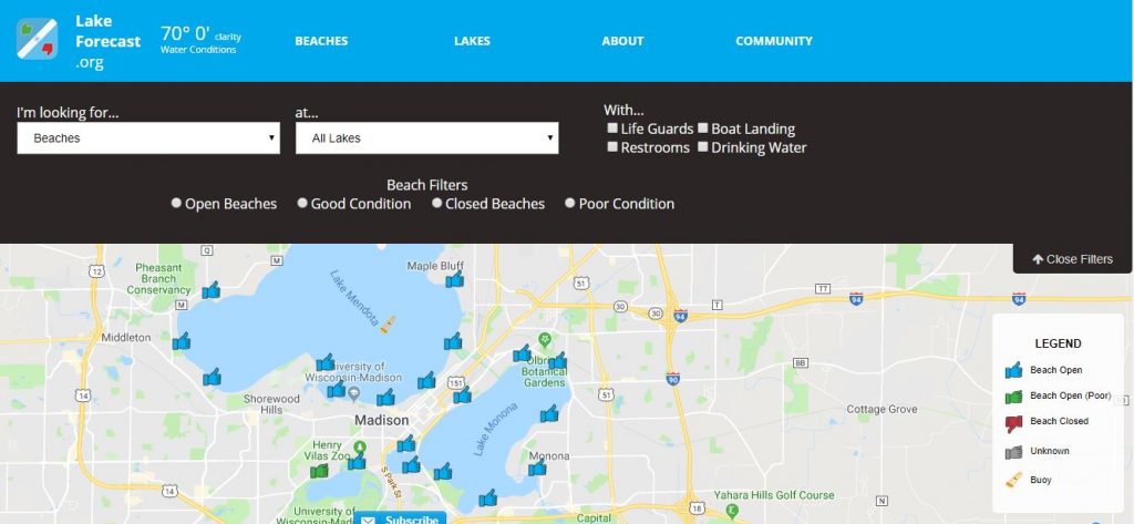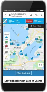 If you haven’t checked the app yet, please do so before heading down to the beach this weekend. The web app is desktop and mobile friendly. LakeForecast.org features separate searching options to filter information about different beaches and lakes. You can view the nearest open beaches, featured amenities, or current water conditions so that you can plan your day accordingly. Users can also view the historical data for each beach and lake site.