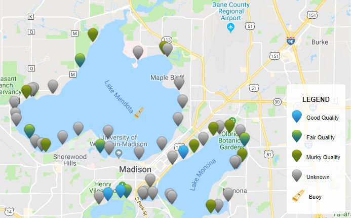 Lakeforecast.org homepage features user login, search field and interactive map of all lakes and beaches in Madison